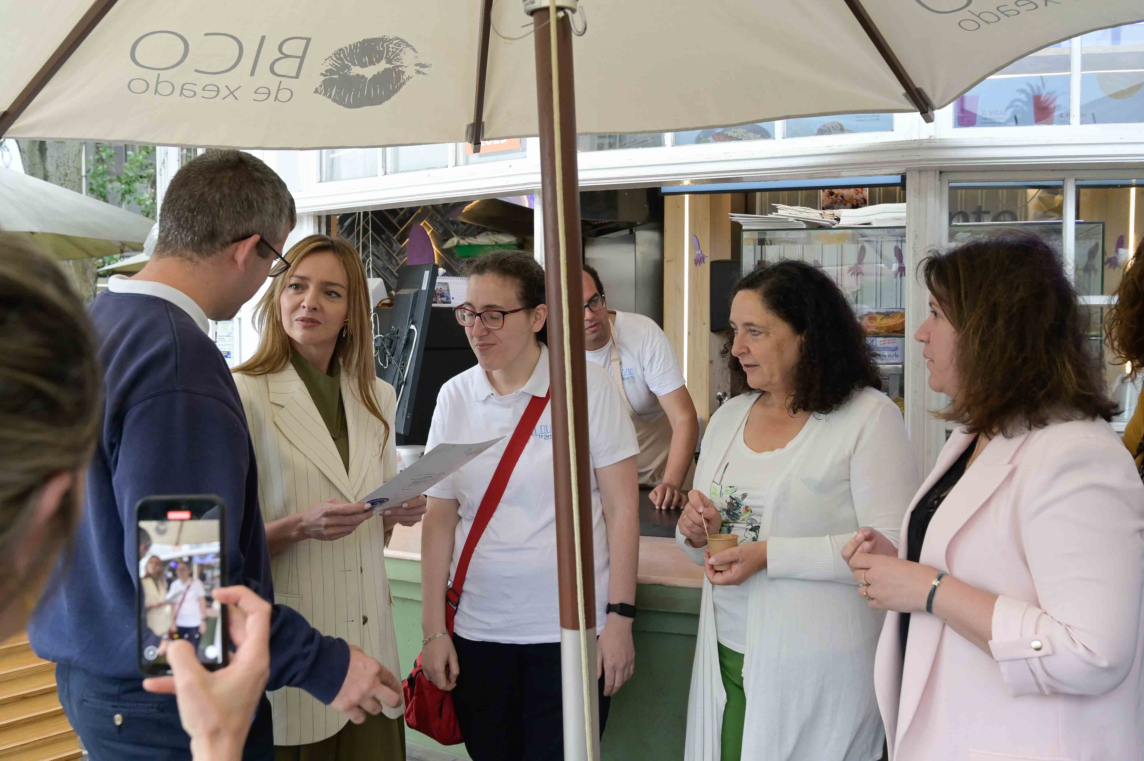 A conselleira de Política Social e Igualdade, Fabiola García, visitou esta mañá o quiosco Down Experiencie, que a entidade Down Coruña ten aberto ao público na Praza de Ourense e no que traballan un grupo de persoas con discapacidade. Durante a súa visita, puido comprobar a oferta gastronómica que ofrece este establecemento e que o ten convertido en punto de referencia na cidade.
